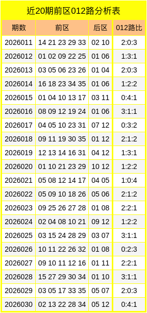 详细分析,第26031期大乐透前区012路比参考3:0:2。