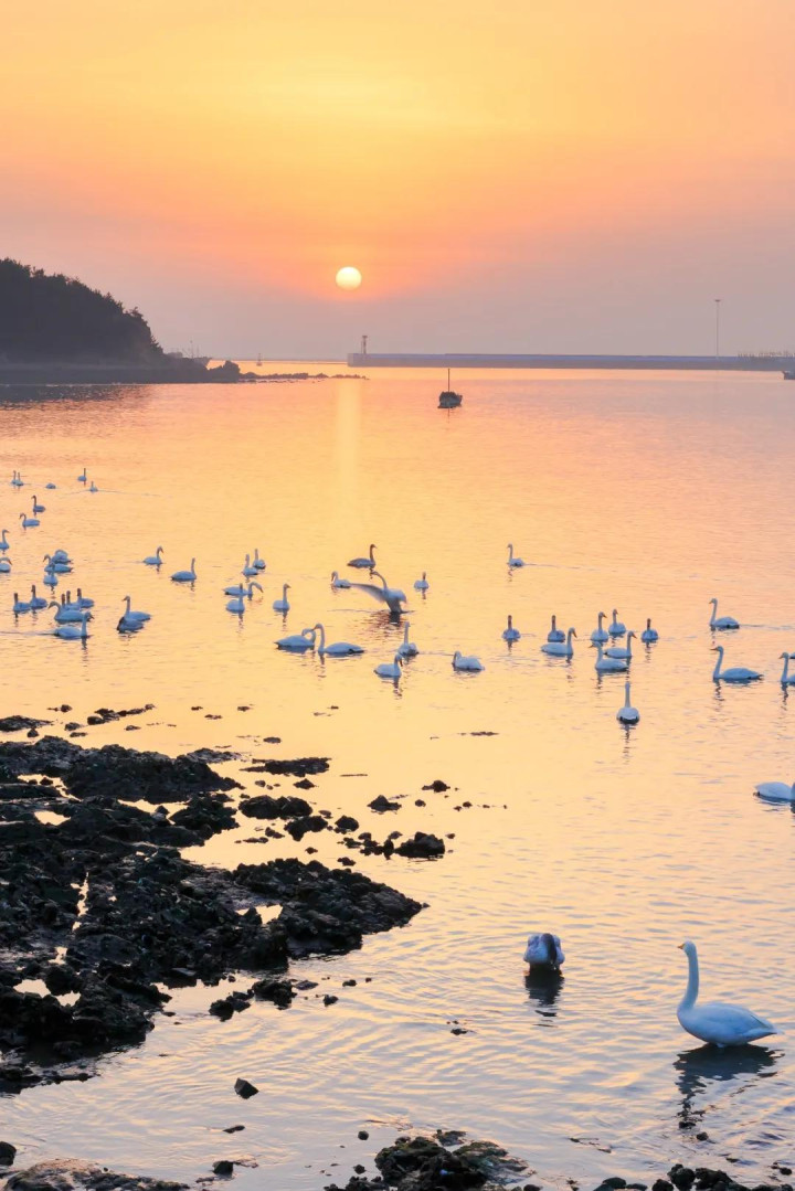 除了“硬核海景”,荣成也有柔柔的一面。比如天鹅湖,这是由沙坝围合变成的潟湖,海水与淡水在此交织。每年冬春之交,大天鹅与海鸥致力于出现,东说念主与鸟的距离被大幅拉近,黑白凡的生态型海岸景不雅。