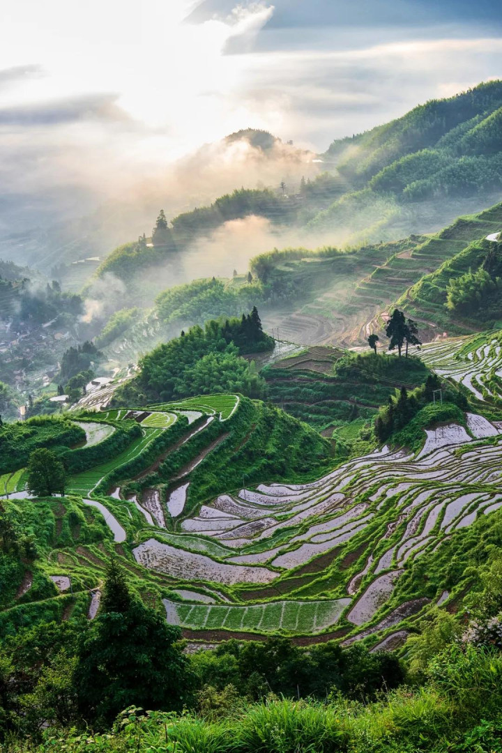 而云和梯田则提供了另一种圭臬。算作华东面积最大的梯田群之一,这里的梯田从海拔两三百米一直延迟到一千多米的山坡上,线条密集而连气儿。每到春季灌水期,梯田反光昭彰,勾通山间潸潸,很容易变成重重叠叠的平地景不雅。