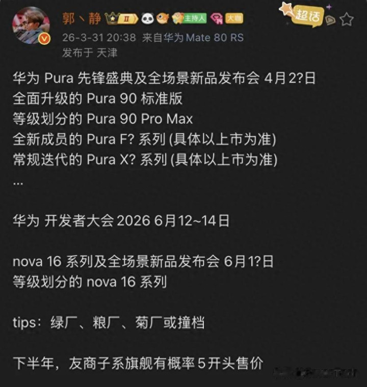 四月已至,本月咱们粗略就能见证别传已久的2026款华为Pura智高手机认真亮相。近日有音讯显现了这些机型可能的发布时分。